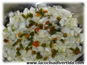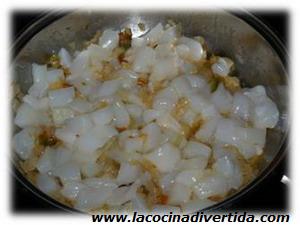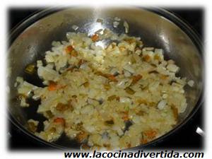 2.- Picamos finamente la cebolleta y el pimiento verde y rehogamos en aceite de oliva a fuego suave hasta que esté la verdura dorada pero sin quemarse. Mientras vamos troceando la sepia limpia