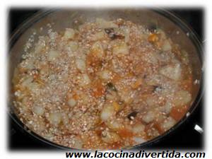 4.- Se añade el arroz y se deja rehogar, cuando está casi a punto de pegarse al suelo de la cazuela vertemos la mitad del caldo, que deberá estar caliente