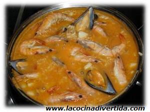 7.- Pasados unos 17 ó 18 minutos el arroz estará casi listo, lo dejamos algo caldoso y retiramos del fuego; rociamos con un chorrito de aceite de oliva y por último añadimos los langostinos y algún mejillón entero. Se deja reposar 5 minutos tapado con un paño de cocina y se sirve.