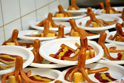 2.- Con cuidado de no quemarnos, hacemos varios cortes longitudinales en dos tercios de la salchicha, de forma que parezcan las patas del pulpo. En el tercio restante, que forma la cabeza, hacemos dos pequeñas hendiduras que simulen los ojos y rellenamos con algo que tengamos a mano.