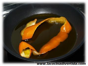 1.- Calentamos el aceite en una sartén con la cáscara de naranja para que tome un poco del aroma; retiramos y dejamos enfriar el aceite.