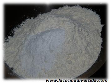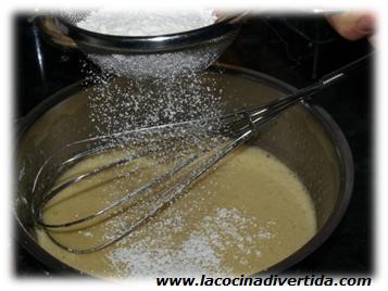 4.- Mezclamos la harina y la levadura y la unimos poco a poco pasándola por un colador (tamizándola), para evitar que aparezcan grumos