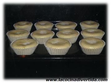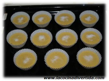 6.- Llenamos los moldes de las magdalenas hasta la mitad (luego crecerá) y echamos un pellizco de azúcar por encima