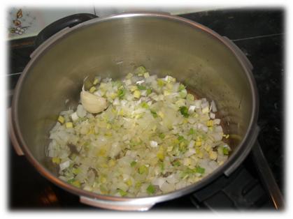 Empezamos picando la cebolla y el puerro y rehogamos en la cazuela (o en la olla) junto con los dientes de ajo enteros.
