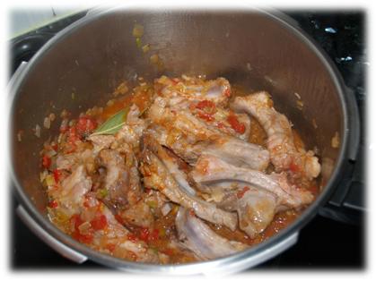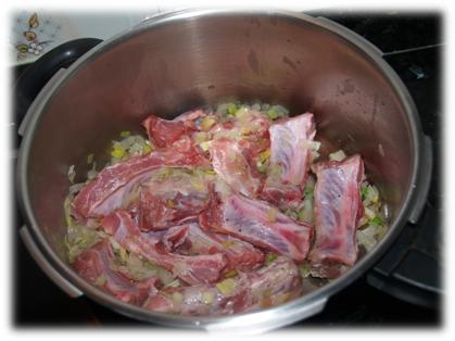 2.- Cuando empiece a tomar color la verdura pero sin quemarse añadimos las costillas salpimentadas, y dejamos rehogar unos minutos. Mientras retiramos los dientes de ajo y les machacamos en el mortero.