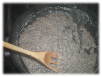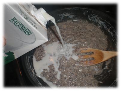 - A continuación, vertemos la leche, de 2 ó 3 veces, removiendo de forma constante, hasta formar una besamel que ha de ser espesa. Añadimos sal.