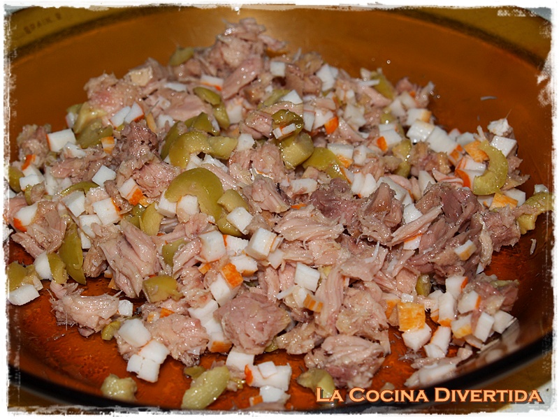 - Una vez cocidos los huevos dejamos enfriar, y mientras vamos preparando el relleno, desmenuzando el atún en aceite y picando bien el cangrejo, las aceitunas y la cebolleta muy picadita.
