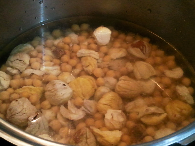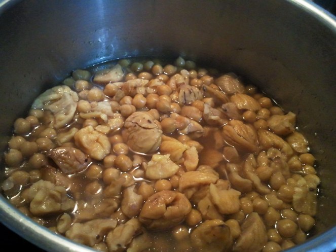 - Se dejan a remojo la víspera los garbanzos y las castañas (la castaña pilonga se ha quedado seca y ha endurecido, por ello también se deja a remojo)