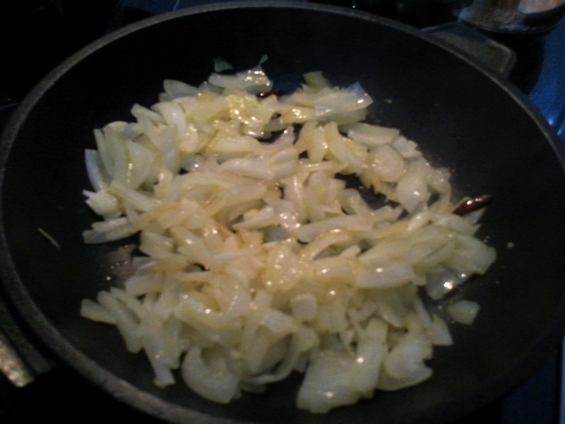 - Por otro lado ponemos en una sartén a rehogar con un chorrito de aceite de oliva el ajo, la cebolla y la guindilla.
