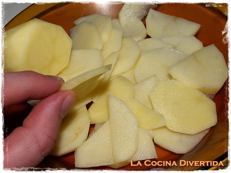 1. Se cortan las patatas en rodajas finas, de medio centímetro de grosor aproximadamente.