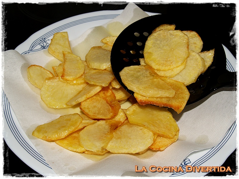 3. Cuando estén fritas las recogemos escurriendo el aceite sobrante y las dejamos en un plato con papel absorbente.
