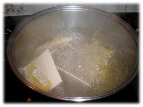 1. En una cazuela con abundante agua hirviendo y sal, vamos introduciendo las placas de canelones uno a uno. Añadimos un chorrito de aceite para ayudar a que no se peguen y dejamos hervir unos 12 minutos (según ponga en el paquete de la pasta).