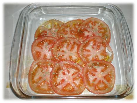 2. En una fuente para horno manchamos con unas gotas de aceite de oliva y colocamos encima rodajas de tomate finas, de 2 ó 3 mm de grosor, y espolvoreamos con orégano y un poco de sal.