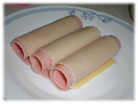 3. Por otro lado, habremos escurrido las placas de canelones y enrollamos con una loncha de jamón york y otra de queso (podemos recortar los sobrantes, pero como podéis ver, aquí lo hemos dejado).