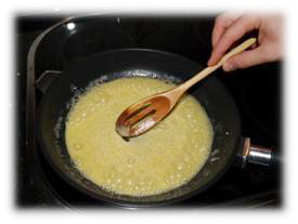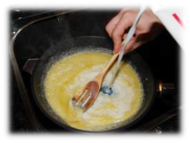 3. Removemos para disolver totalmente la harina; este paso es muy importante pues si no está cocinada la harina después quedarían grumos; también hay que evitar que se queme la harina (os repito que la besamel es una salsa fácil de hacer, aunque las primeras veces nos salga mal).