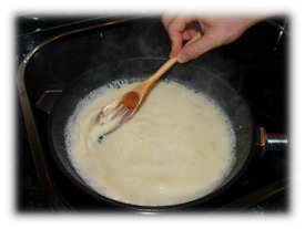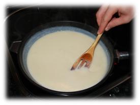 5. Según se vaya quedando espesa la salsa añadimos más leche y salamos; continuamos removiendo para evitar que se pegue al fondo.