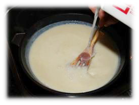 4. Añadimos la leche (aprox. 1/2 litro) removiendo continuamente para que se mezcle bien; al principio de añadir la leche es uno de los momentos más delicados y puede parecer que han quedado grumos, pero la mayoría de las veces desaparecen cuando se mezcla bien la leche con la harina cocinada.