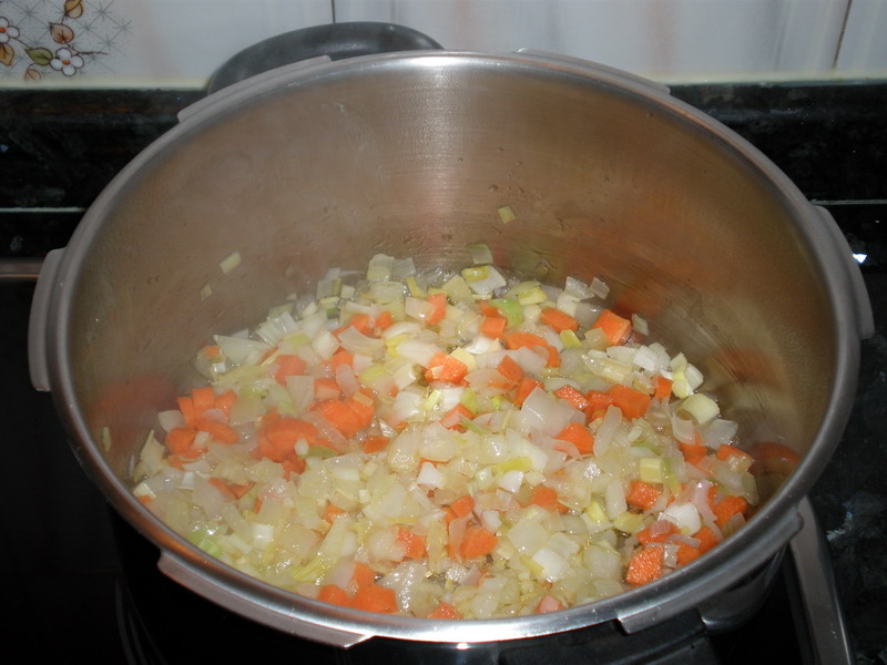 - Picamos la cebolleta, la zanahoria y el ajo y rehogamos en una olla con un chorrito de aceite de oliva a fuego medio. Mientras, troceamos la carne en dados (o pedimos al carnicero que nos lo trocee) y salpimentamos.