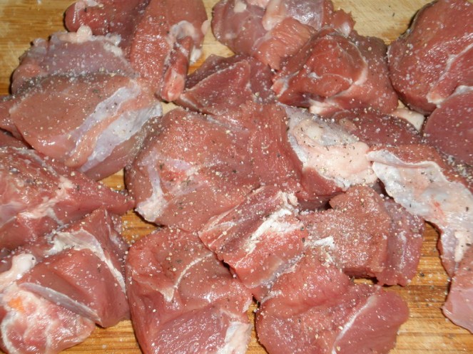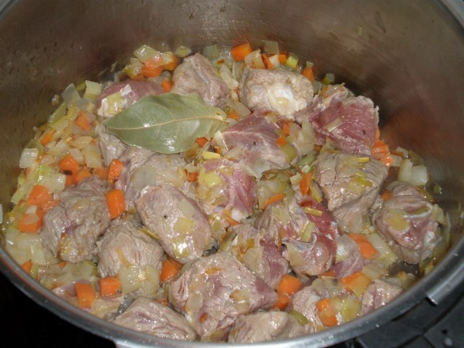 - Cuando la verdura esté rehogada añadimos la carne y una hoja de laurel; dejamos que se rehogue 3 ó 4 minutos para que cambie de color; transcurrido este tiempo echamos un chorrito de vino blanco.