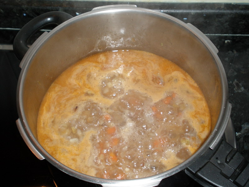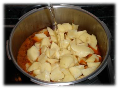 - Dejamos que se evapore el alcohol del vino y añadimos agua, o caldo, hasta que cubra la carne. Cerramos la olla y una vez que tenga la presión adecuada bajamos el fuego al mínimo y dejamos 30 minutos (este tiempo depende de la rapidez de la olla utilizada).