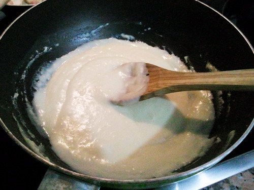 2. Mientras, preparamos la salsa besamel. No debe quedar muy líquida, pero tampoco tan compacta como si fuésemos a hacer croquetas. La idea es cubrir la plancha de masa casi por completo, dejando 1 cm alrededor sin cubrir con la besamel.