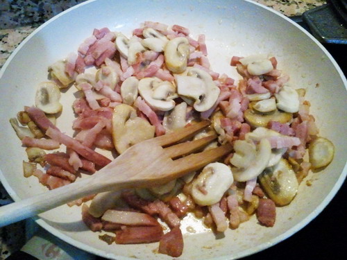 3. En una sartén con una gota de aceite (esto es casi literal, una cucharada o menos, incluso si la sartén es antiadherente no haría falta nada) se saltean los champiñones a fuego fuerte, junto con el bacon, y el diente de ajo durante 2 ó 3 minutos. Lo importante es dar un golpe de calor, para que así no suelten agua los champiñones una vez en el horno. Yo luego retiro el diente de ajo, pero eso a gustos.