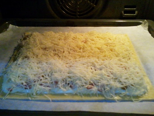 4. Estiramos la masa en una bandeja de horno sobre papel especial y colocamos primero la besamel (dejando ese centímetro alrededor que comenté antes) y después los champiñones con el bacon. Cubrimos todo con queso rallado y horneamos (el horno precalentado a 200º) durante 15 minutos hasta que se haga la masa (igualmente nos fijamos en la caja de la masa para ver las indicaciones del fabricante).