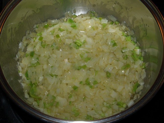1. Picamos la cebolla y el pimiento verde y los ponemos a rehogar en una cazuela a fuego suave.