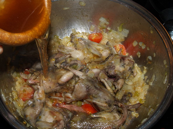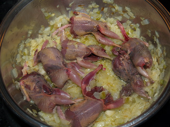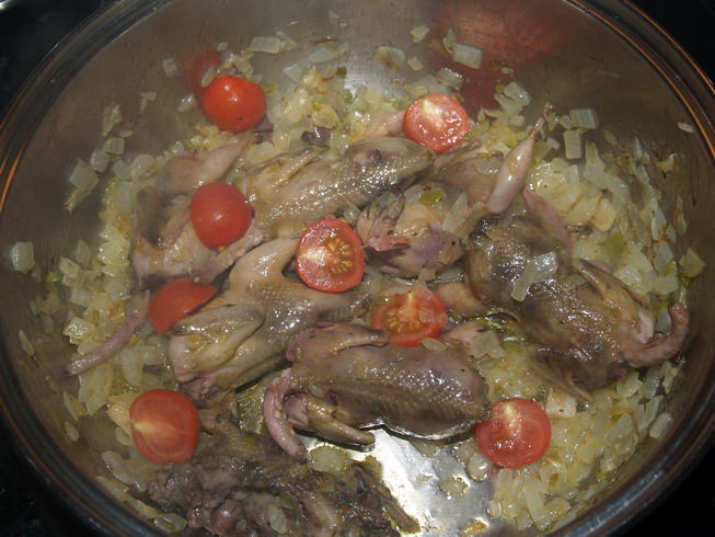 2. Cuando la verdura tome un tono tostado pero sin quemarse añadimos las codornices limpias.