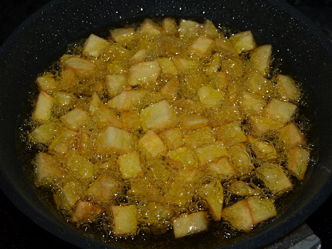 6. Mientras se guisan las codornices partimos la patata en dados y les freímos en abundante aceite de oliva (este aceite podremos utilizarlo en otros platos).