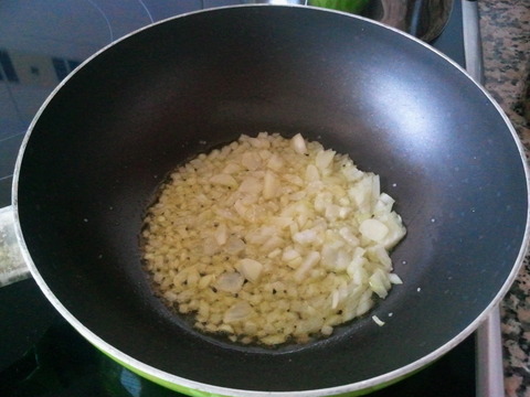 - En una sartén ponemos a rehogar 3 ó 4 dientes de ajo y media cebolla a fuego medio.