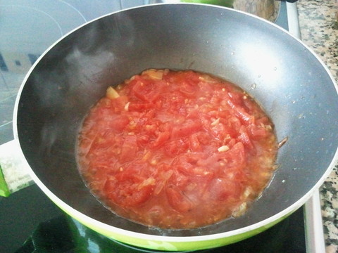 - Cuendo empiece a tomar color, sin quemarse añadimos los tomates sin piel y troceados y dejamos el conjunto unos 10 minutos.