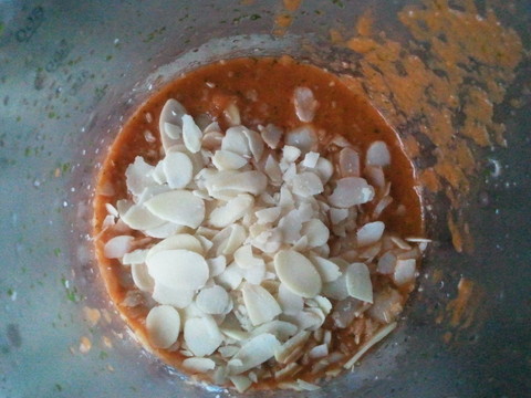 - Trituramos la salsa con un chorrito de vino blanco y añadimos las almendras (en este caso eran almendras laminadas)