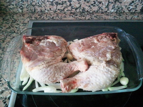 - Asamos en horno a 200º durante 40 minutos con la piel para abajo, damos la vuelta, regamos con el caldo, y añadimos más líquido si fuese necesario y mantenemos otros 30 minutos hasta que la piel esté tostada y la carne hecha por dentro.