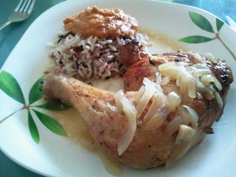La verdad es que quería hacer una salsa de tomate y utilizar unas cuantas hojas de albahaca que tengo en casa y hay que darlas salida. Lo demás fue llegando poco a poco, el arroz para acompañar la salsa, y el pollo acompañándo al arroz, y así todos juntos, en amor y compañía. El resultado fue un plato muy rico y con alimento. Merece la pena.