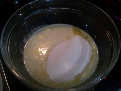 - Troceamos la mantequilla y derretimos al baño maría, o bien en el microondas a muy baja potencia (como para descongelar)