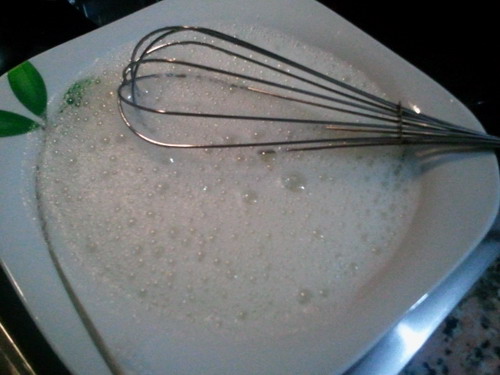 - Montamos las claras a punto de nieve y mezclamos a la masa con movimientos envolventes. En todo el proceso he utilizado varillas excepto en este paso, que cambié por una lengua de cocina (o una cuchara de palo).