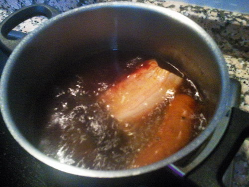 - Por otro lado, he puesto en una cazuela el chorizo, la morcilla curada (esta no se rompe en la cocción) y la panceta adobada, cociéndolo a parte para que tenga menos grasa el plato.
