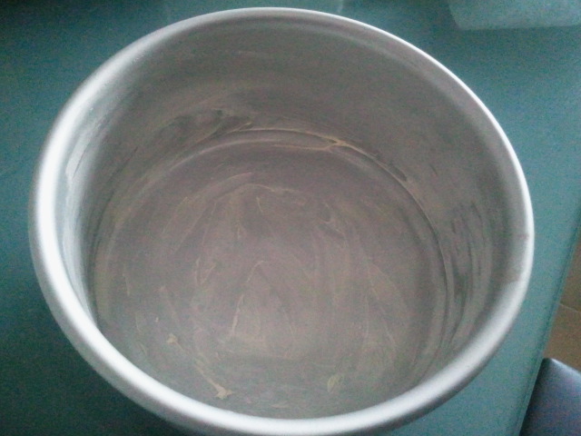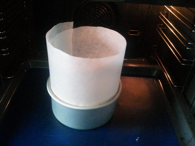 5. Cubrimos el molde ligeramente con margarina, que como ya he comentado ha de ser estrecho y a ser posible alto, y recortamos papel de horno con el que cubriremos el suelo y paredes del molde como se ve en la foto. La margarina la pongo para que se pegue el papel mejor. El papel de horno ha de ser más alto que las paredes del molde, para que quede la forma del panettone cuando suba la masa.