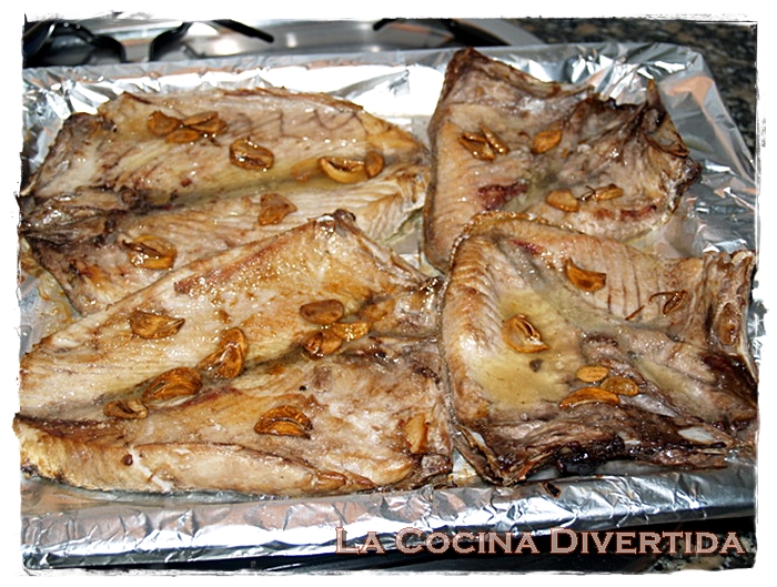 La receta de hoy está hecha con su parte más sabrosa, la ventresca. Es una pieza cercana a la cabeza en forma casi triangular como veréis en las fotos. Es muy sencillo de hacer al horno, y sólo lleva como acompañamiento un sofrito de ajos y un poco de limón. Sensacional.