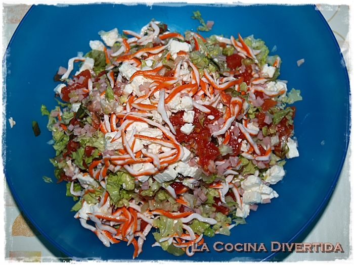 El surimi, al igual que las gulas, son productos elaborados a base de pescado que suelen gustar a quienes el pescado no es su fuerte, pero además su valor nutritivo es bastante aceptable, con un alto nivel de proteínas y sin grasas saturadas. En este caso se ha utilizado unas gulas de surimi de cangrejo, por eso son gulas anaranjadas, pero lo podemos hacer con la gula normal, o con las barritas de surimi de cangrejo cortadas en juliana, formando tiras finas.