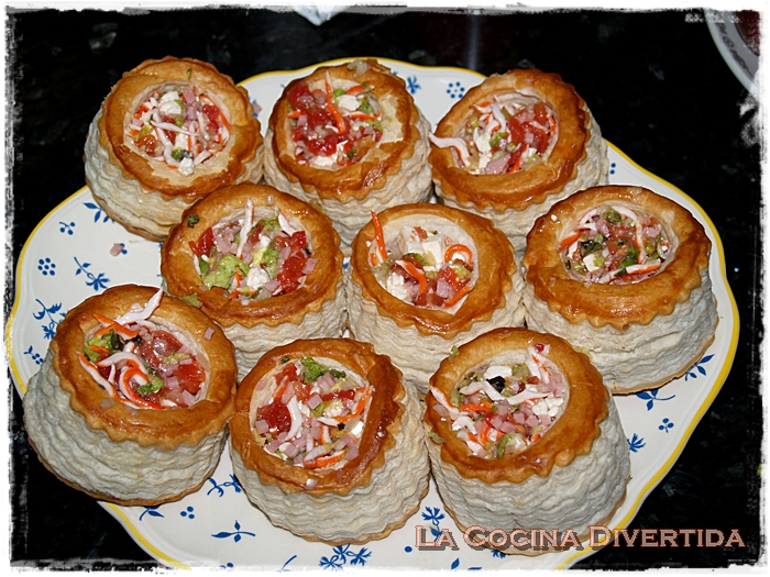 Los hizo Héctor ya hace tiempo y estaban ahí pendientes de salir a escena (como receta, porque los volovanes acabaron en unos minutos, jeje). Esta es una receta que no necesita cocción, ya que para facilitarlo y que no eche para atrás a nadie se han utilizado productos ya elaborados, como los propios volovanes. Que si queréis hacerlos también se puede, con una plancha de hojaldre y dos cortapastas de igual forma pero distinto tamaño, pero vamos a dejar eso para otra cuestión, porque es más lioso (que no es lo se busca con esta receta).