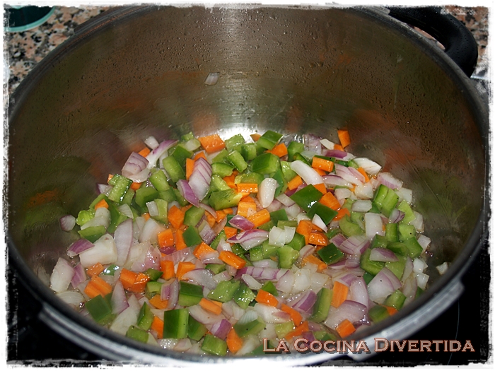 3. En la misma olla con el aceite y grasa que hayan soltado las carrilleras vamos a rehogar las verduras (ajo, cebolla, zanahoria y pimiento verde) durante unos 10 minutos con un poco de sal.