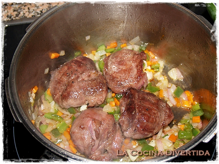 4. Una vez blanda la verdura, añadimos las carrilleras que teníamos reservadas y una hoja de laurel.