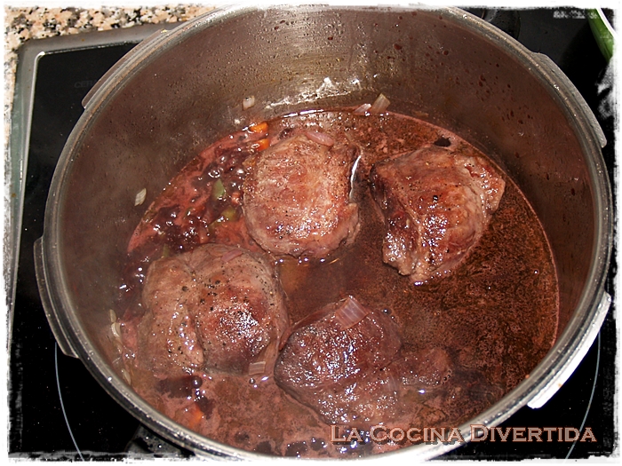 5. Subimos de nuevo el fuego a medio-alto y regamos con el vaso de vino tinto. Dejamos que evapore el alcohol y añadimos el caldo o agua y un poco de sal. Cerramos la olla y una vez que suba la presión dejamos cocinar 25 minutos (este tiempo depende de ollas, en cazuela normal este tiempo será de hora y media a dos horas).