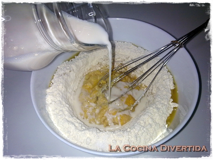 - Se calienta brevemente la leche en el microondas para que quede tibia, y se echa la levadura bien desmigada. Remover un poco para que se disuelva bien. Es importante que la leche sólo esté tibia, no caliente, pues la levadura muere y no fermentaría.