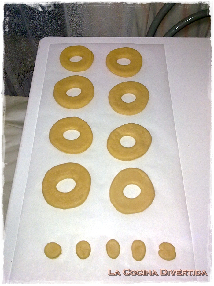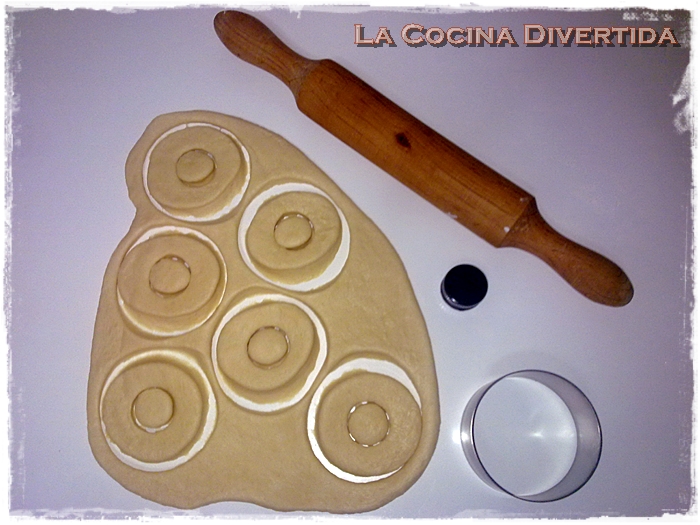 - Ponemos de nuevo la masa en la mesa o encimera y con un rodillo estiramos de modo que quede de aproximadamente 1 cm de grosor. Para que no se nos pegue a la mesa colocamos la masa sobre papel sulfurizado (papel de horno). Con la ayuda de dos moldes circulares vamos haciendo la forma de los donuts con su agujero en el medio. Existen moldes específicos, aunque podemos utilizar cualquier objeto que nos valga, por ejemplo un bol de desayuno y un tapón, todo es probar. Con los recortes y las partes sobrantes volvemos a amasar para hacer más donuts. Podemos dejar alguno de los círculos interiores para cocinarlos también.