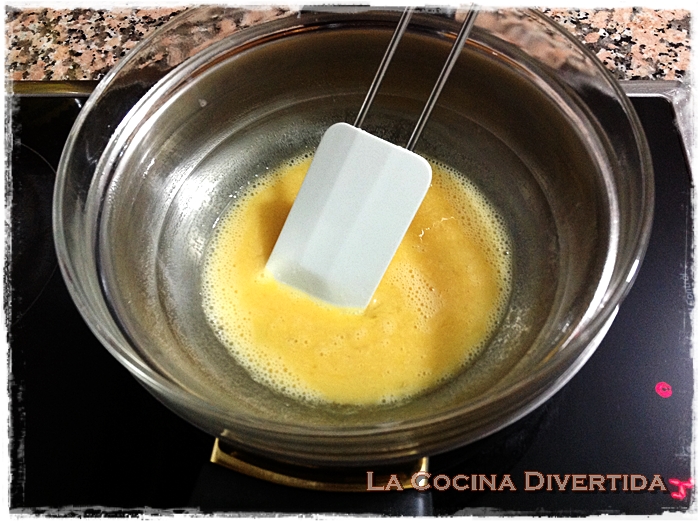 2. Por otro lado preparamos los huevos, batiéndolos en un bol con un poco de sal y sumergiendo el bol en una cazuela con agua para hacerlos al baño maría. Si ponemos el agua a fuego muy fuerte se hará demasiado rápido y no quedará tan cremoso. Lo he tenido 15 minutos a fuego medio (eran 3 huevos y en la receta he indicado 5, cantidad para cuatro personas, así que puede que necesite unos minutos más). Hay que estar removiendo de contínuo y notarás que la textura va cambiando y se va cuajando pero como una crema, no como una tortilla.
