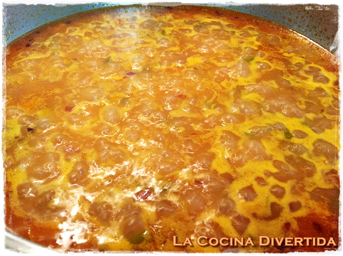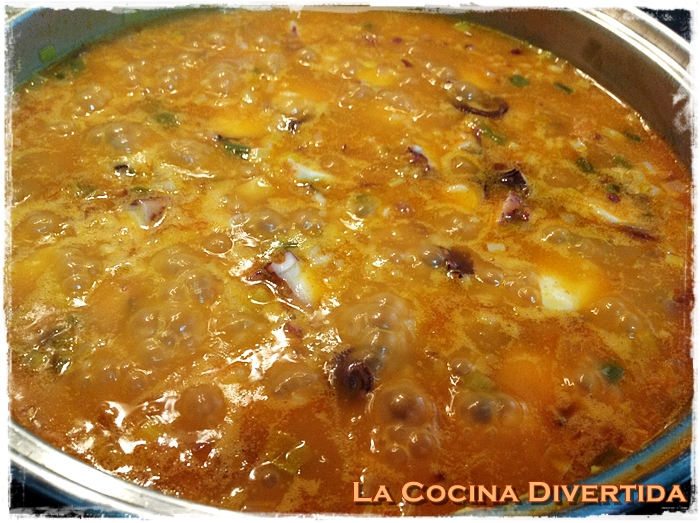 - Añadimos el pulpo y dejamos 5 minutos más. Si vemos que se consume el agua podemos añadir un poco más, este arroz está muy rico ligeramente caldoso, tampoco una sopa eh?