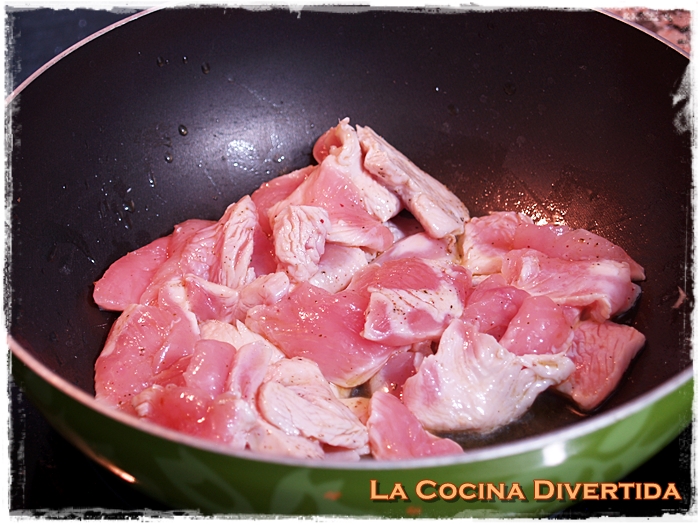 1. Primeramente vamos a cortar la carne del solomillo en tiras finas de unos 2 centímetros. En el caso de la carne de pavo, no importa que sea algo más porque se hace en la sartén muy rápido. Salpimentamos.